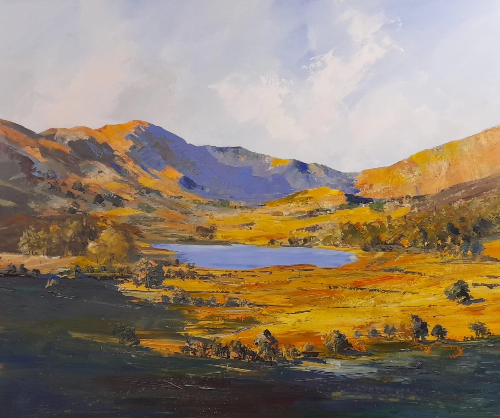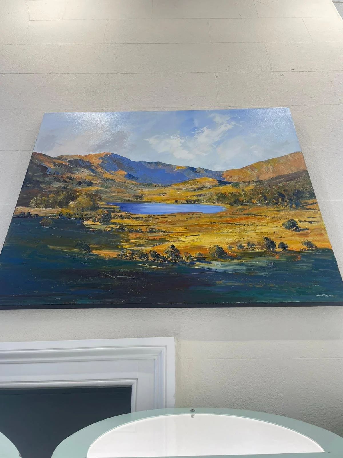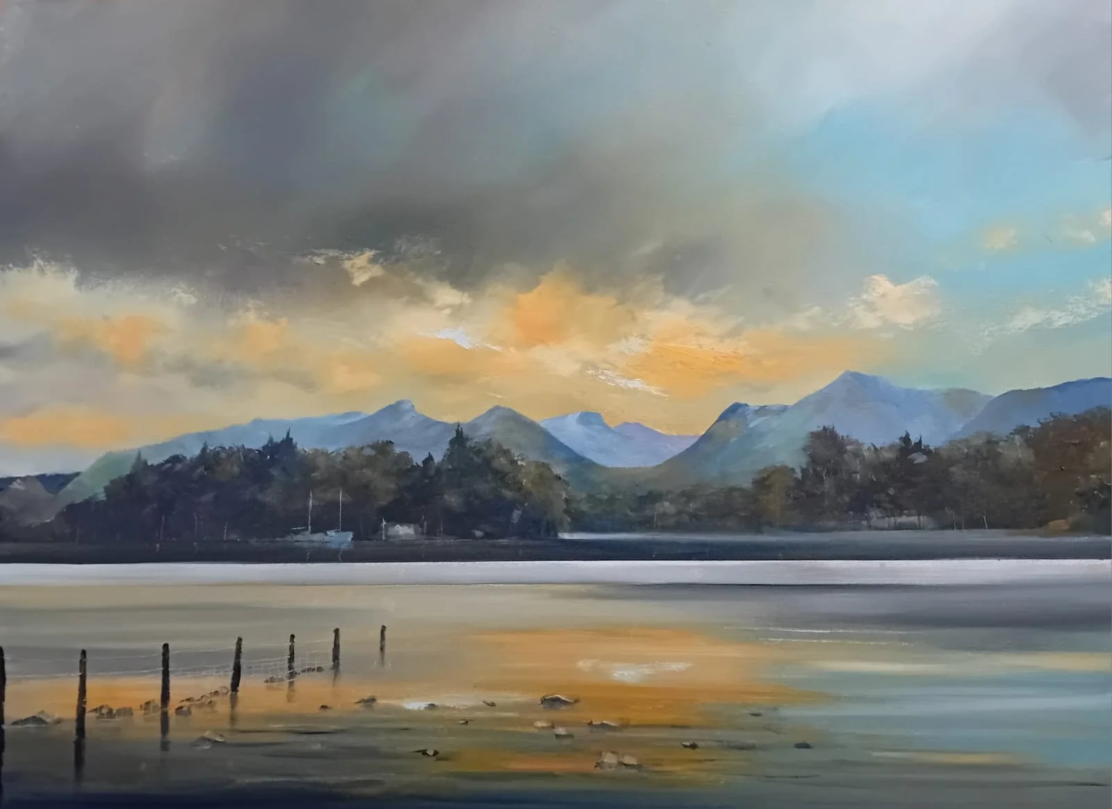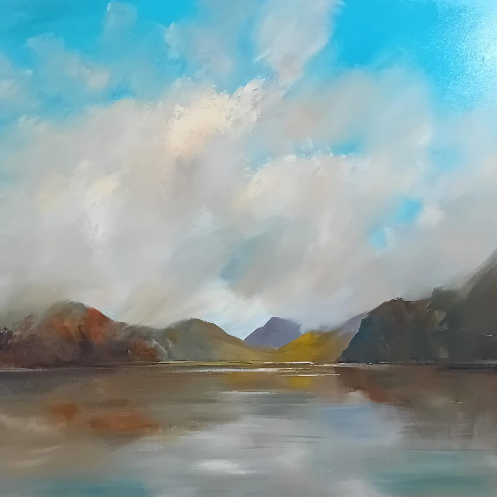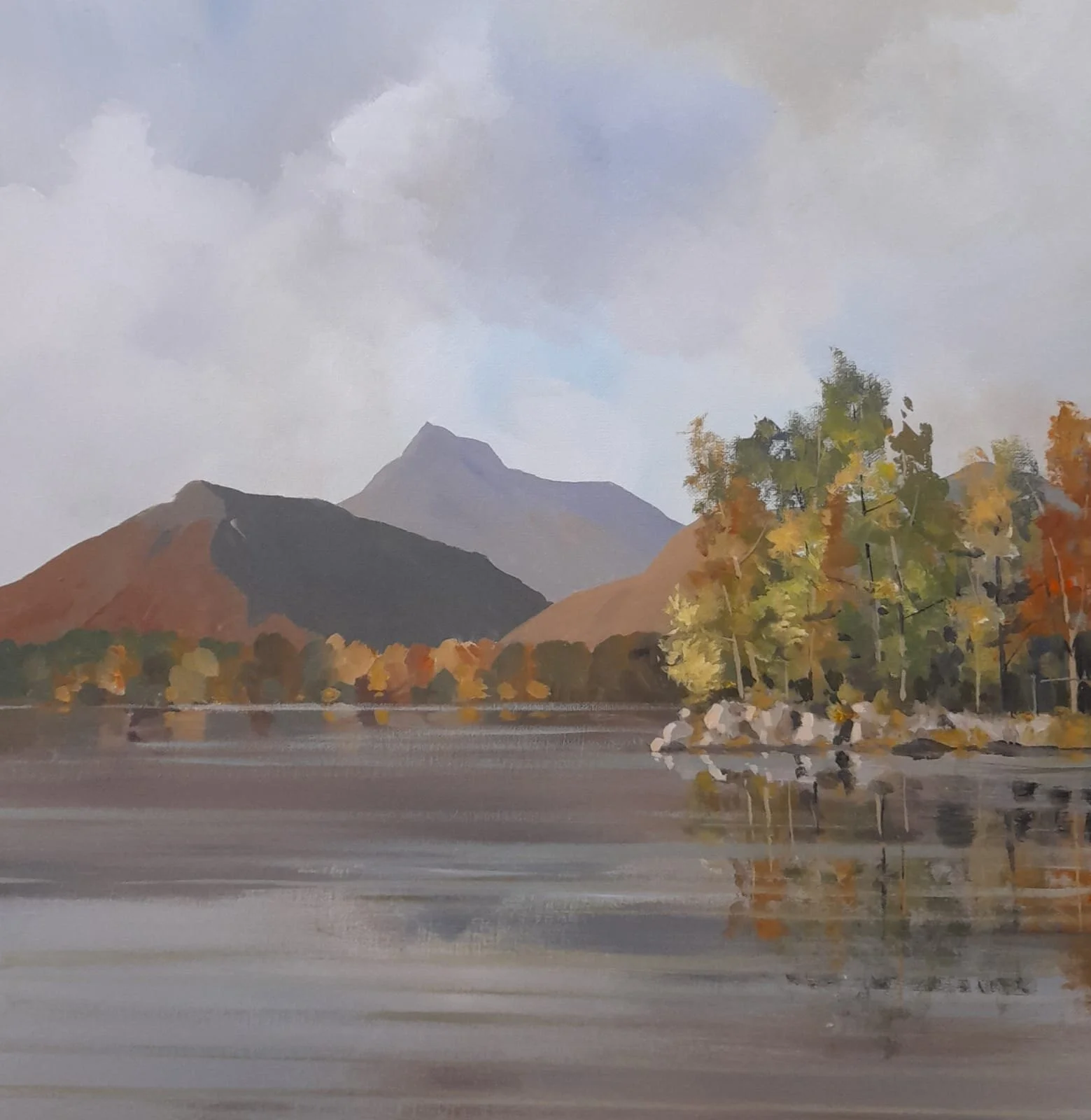 I didn’t want a mirror image of reflections in the water but did want a tranquil lake with a hint of movement. I put in the rough reflections and blended them into a patch of light through the middle. Overall, I think I got the tranquil feel to the painting whilst creating a misty feel with filtered light catching different points to add interest. From the photograph below it is difficult to see the scale of the painting but in my studio it looks great.