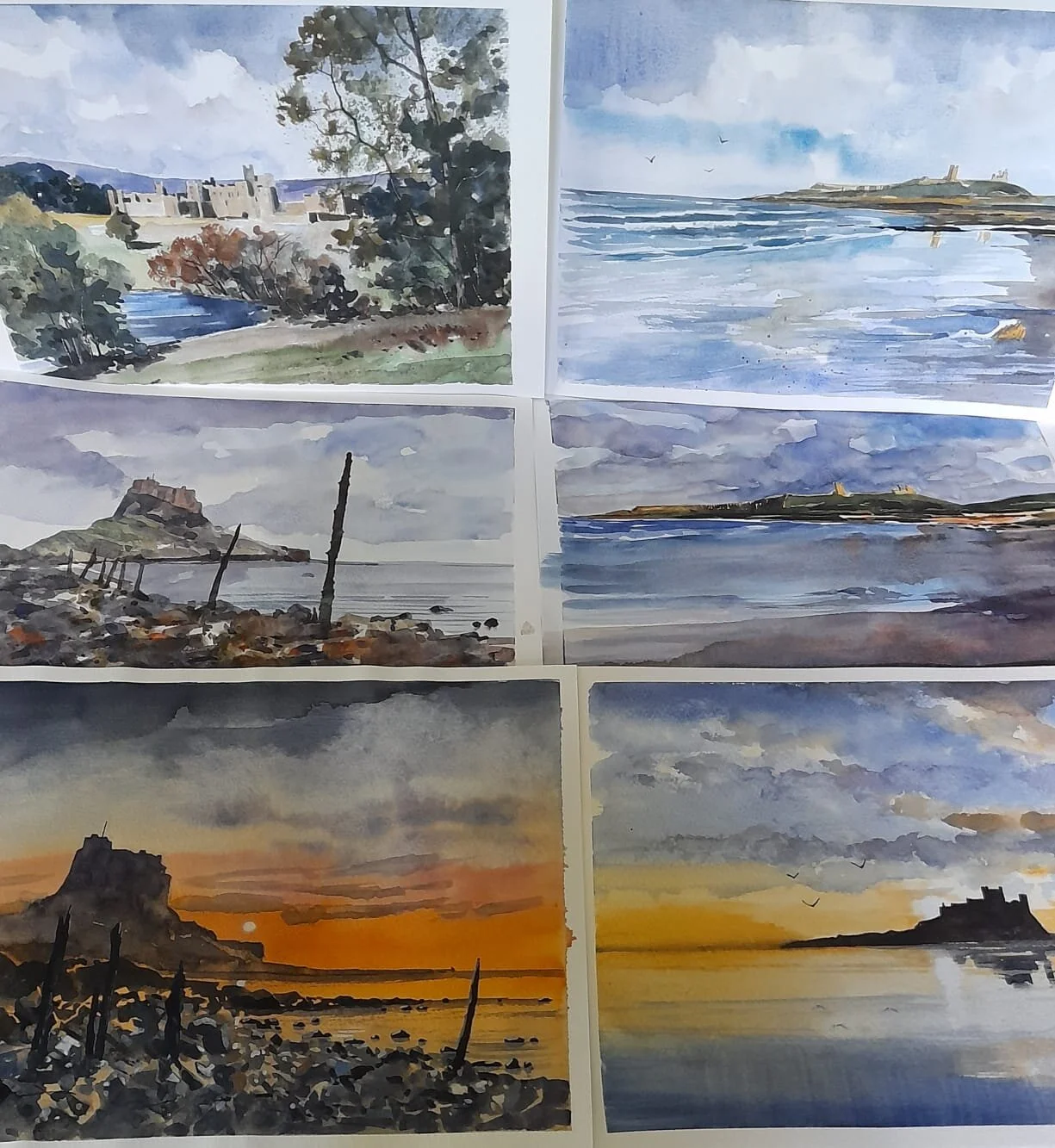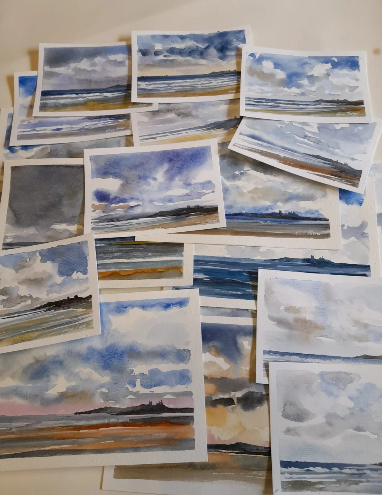 I have loads of other stuff in my studio as my latest inventory showed (see previous blogs) which is fine but at AITG a lot of visitors want to take a little reminder of their holiday in Northumberland back with them and so the local scenes are vital. Having made a start I can add to the collection whenever I get the time. I have also finished framing the 8”×6” hand painted watercolour cards, which also sell well.