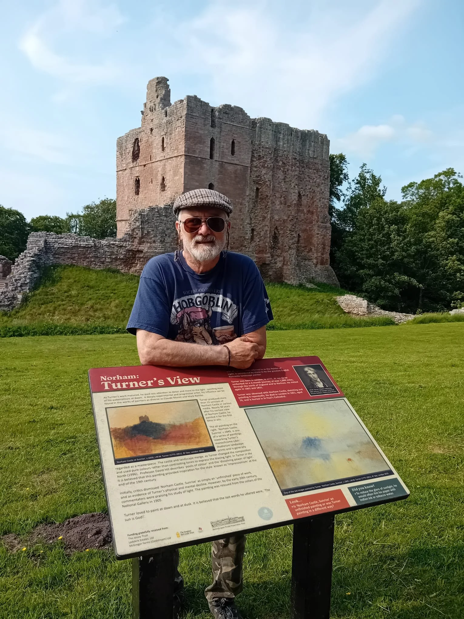 After a nice lunch outside at Carnabys in the tiny village of Brownieside, we headed over to Twizel which proved to be a tiny little hamlet with no castle! A local told us that Twizell Castle was way up off the A1 near Berwick. We decided to go anyway. We eventually found it having driven along the Scottish border. We climbed through a wood and discovered the, now ruined, “castle”, which was more of a fortified manor house. It was in poor repair and overgrown but nevertheless worth the trip. As we were up there we decided to visit Norham, a beautiful little village on the River Tweed which also boasted a castle made famous by paintings by Turner who visited several times. This castle owned by English Heritage was also under repair. Most of it was closed off but was subsequently free to enter. We took photos including me behind an information board showing 2 of the Turner paintings. We had a quick pint in the pub before returning home. It was a couple more ticks on our places to visit in Northumberland list.