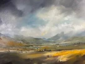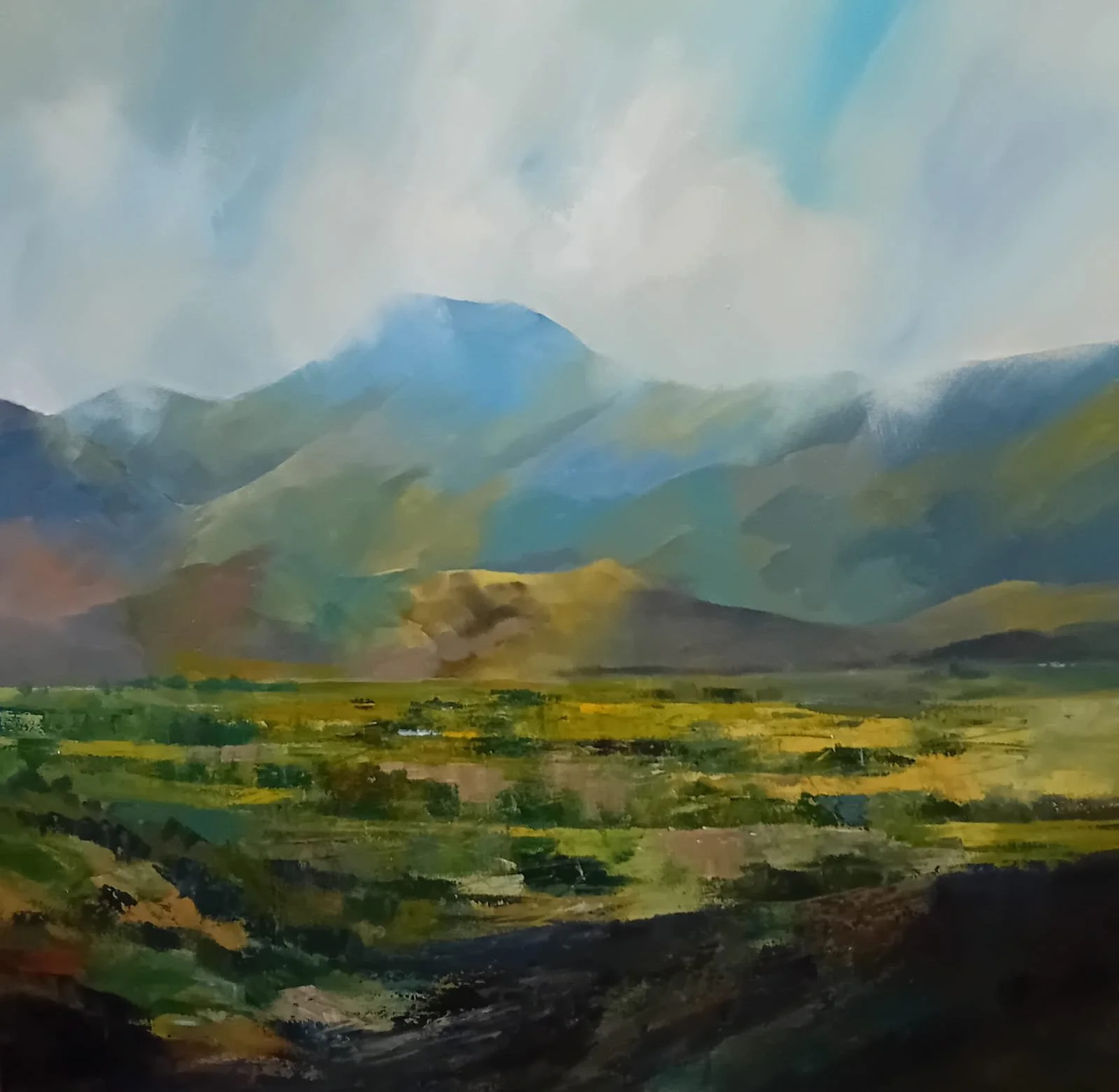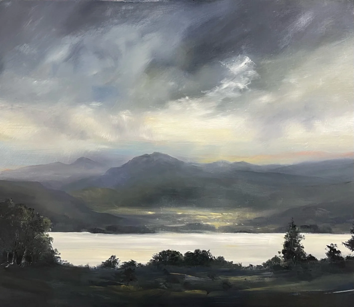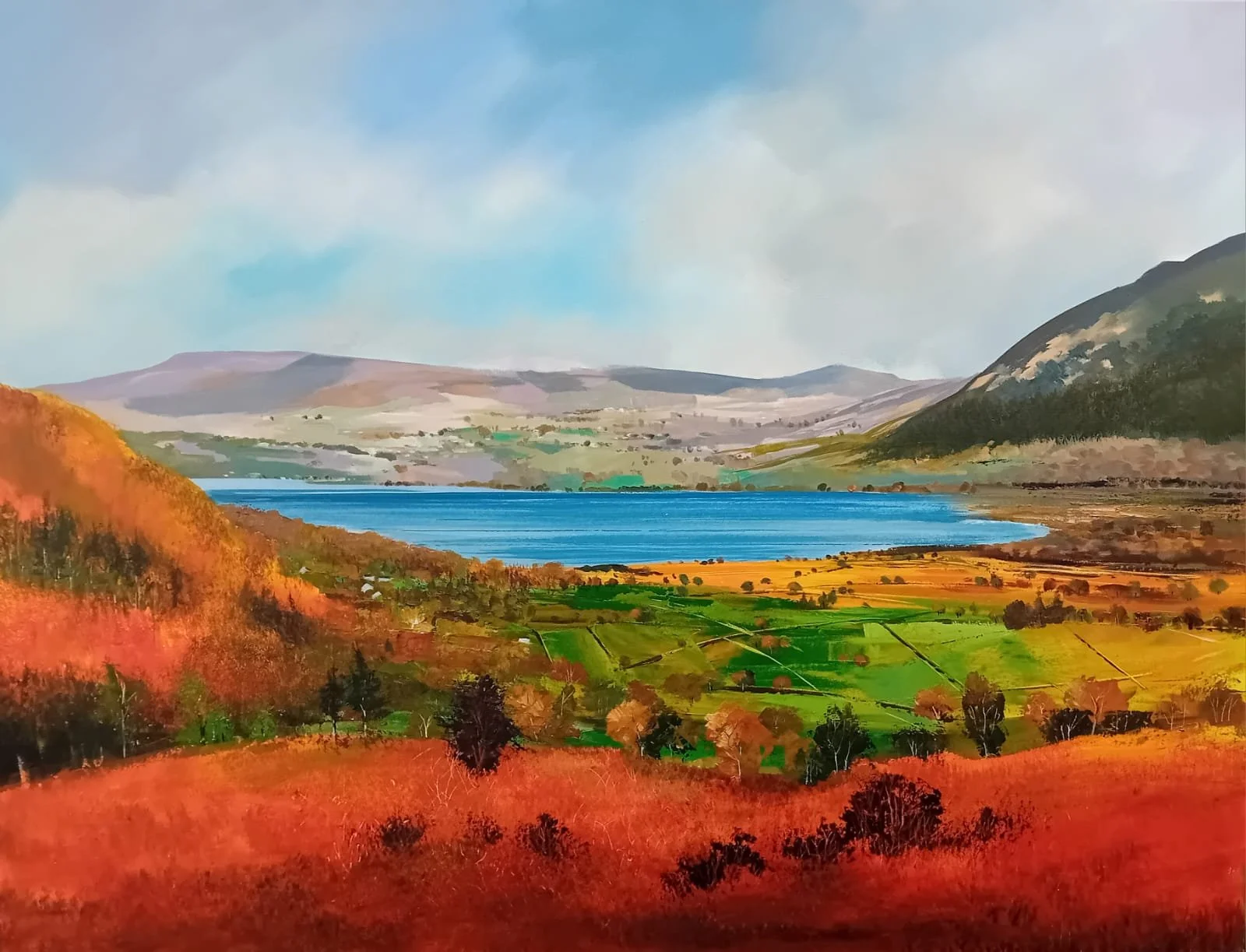 I decided to do a large picture on Wednesday. With Luna in doggy daycare, I had a complete day to tackle the very large 90cm x120cm deep edged canvas, this time in oils to help give me time for the large areas of blending. The sky was an interesting mixture of clouds and blue sky with blending to soften it. I had to be careful with the grades of blue-grey for the distant fells in order to get them receding in order. I wanted a calm but a little misty feel to the painting. I used a blending brush to blur out some of the sharp edges and create a light filtering through the Fells with a highlight on the distant water. There was a nice Treeline headland which was painted loosely to keep it relatively distant whilst adding a touch of colour as the filtered light caught various trees. The foreground fell on the left was again kept loose but had the odd highlight picked out as the light caught it.