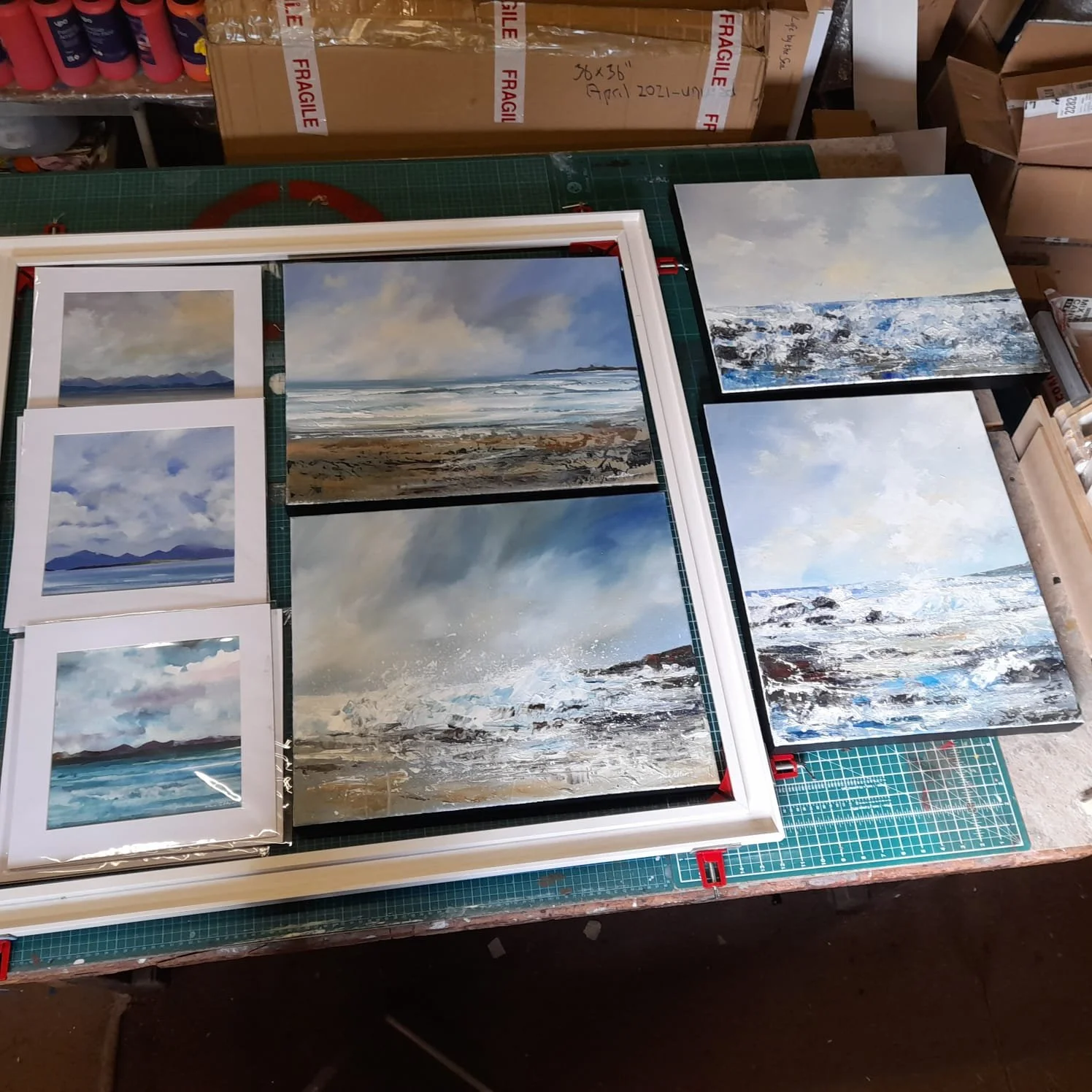 Last week I was concerned that my major galleries were very quiet at the moment. This week I was delighted to get a surprise email from Bob Corsie at Watson Gallery in Edinburgh to tell me they’d sold 7 paintings. Now that’s more like it. He also asked for some more large paintings. I already had some prepared for him so I packed them up ready to send. These were mixed media, textured Scottish seascapes with a lot of palette knife work and impasto using heavy texture paint, splatters and dribbles. Loosely painted they still had the recognisable, distant profiles. They will look great when Bob gets them framed. Bob confirmed that it’s been hard work in the gallery recently and his sales were down. However, I was pleased with the sales.