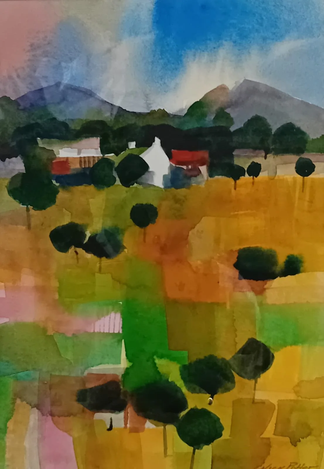 The addition of the gesso on the board which itself is quite absorbent produces random effects which can't always be controlled. The result is an interesting semi abstract landscape.