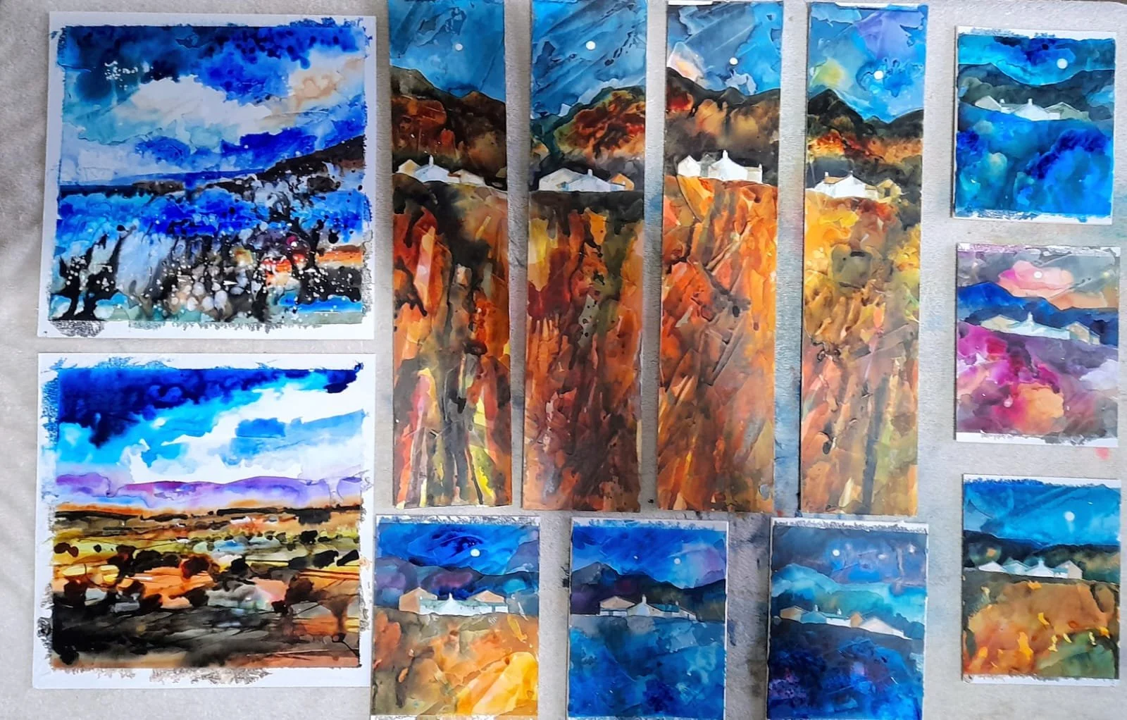 Many years ago, I discovered the vibrancy and versatility of acrylic inks. Together with watercolour and the gesso on mountboard on which they are painted they give unusual and not always predictable effects. I approach them as I do watercolours sat at my painting table (a draughtsman's table I acquired many years ago).