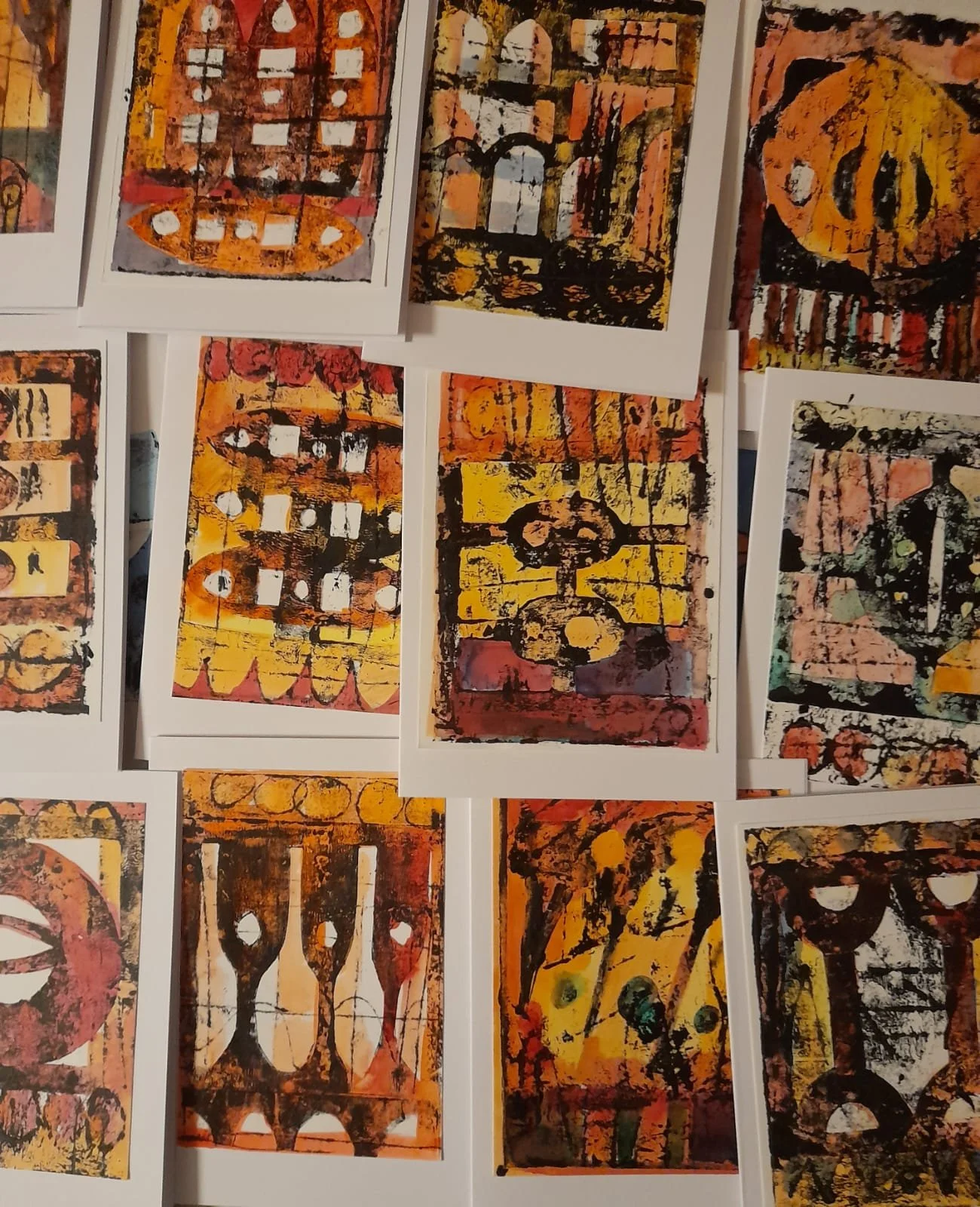 As I said in my previous blog, I did some different work. I produced many monoprints, I painted over 60 watercolours of birds, did 150+ acrylic ink pictures and 30+ black and white ink pictures of Rock Icons. I made over 100 cards, monoprints and abstract ink pictures. I also did my little ink flower pictures and gave them, on request, to family and friends. Natasha gave monoprints to her hard-working colleagues in the hospital.